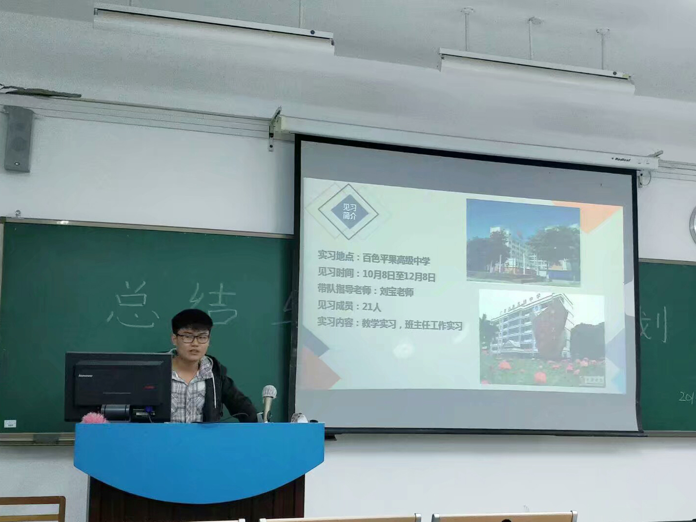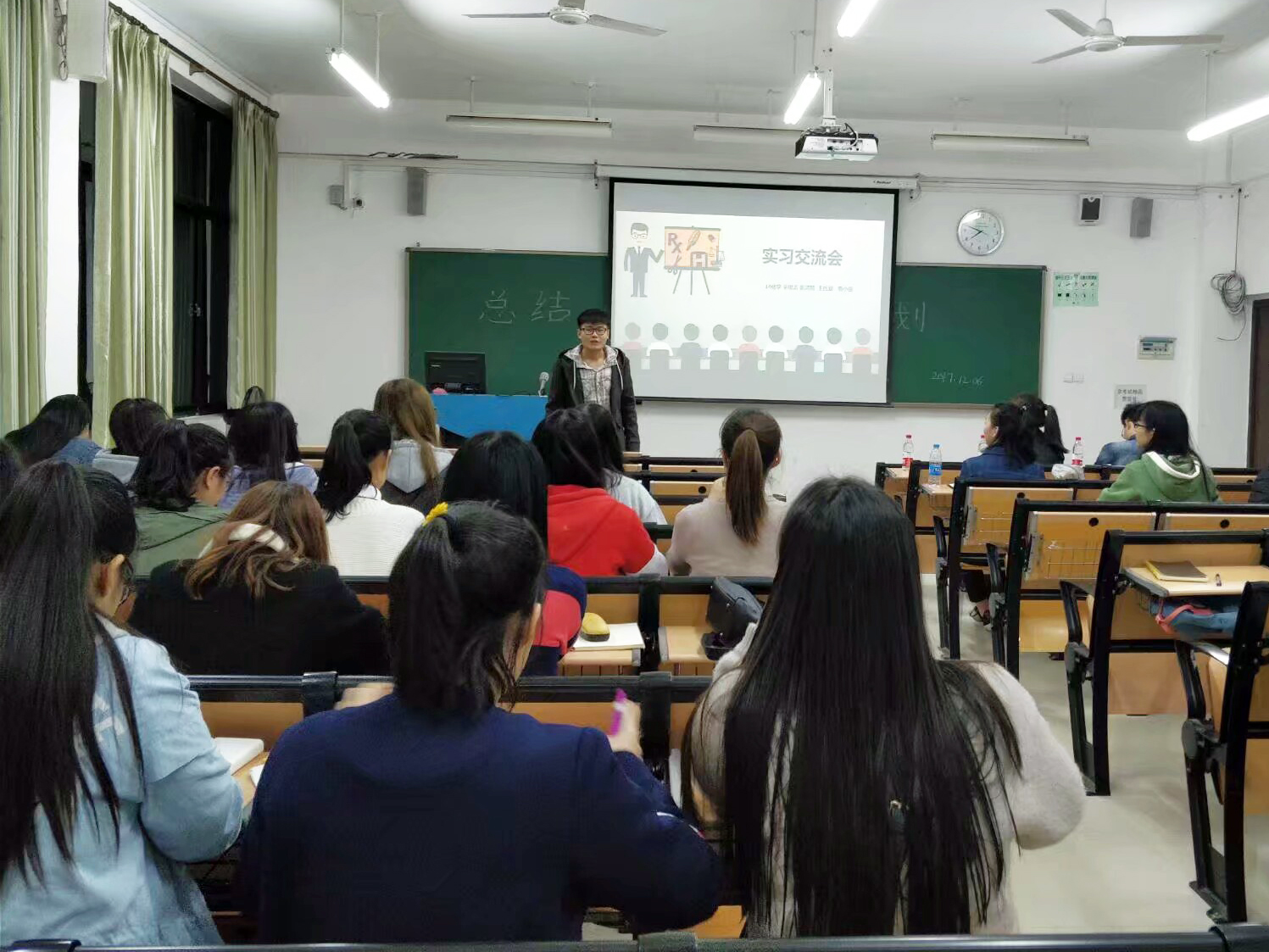 接着,班助辛俊志结合PPT向我们传授教学方式和表达技巧。师姐王氏霜给我们演示了她在实习时如何给学生讲课,并传授一些讲课的经验和方法。张鸿熙师兄给我们讲述了他在学校实习时的经历和趣闻。虽然只是短短的几十分钟,师兄师姐的忠言良语却让我们终生难忘,受益匪浅。