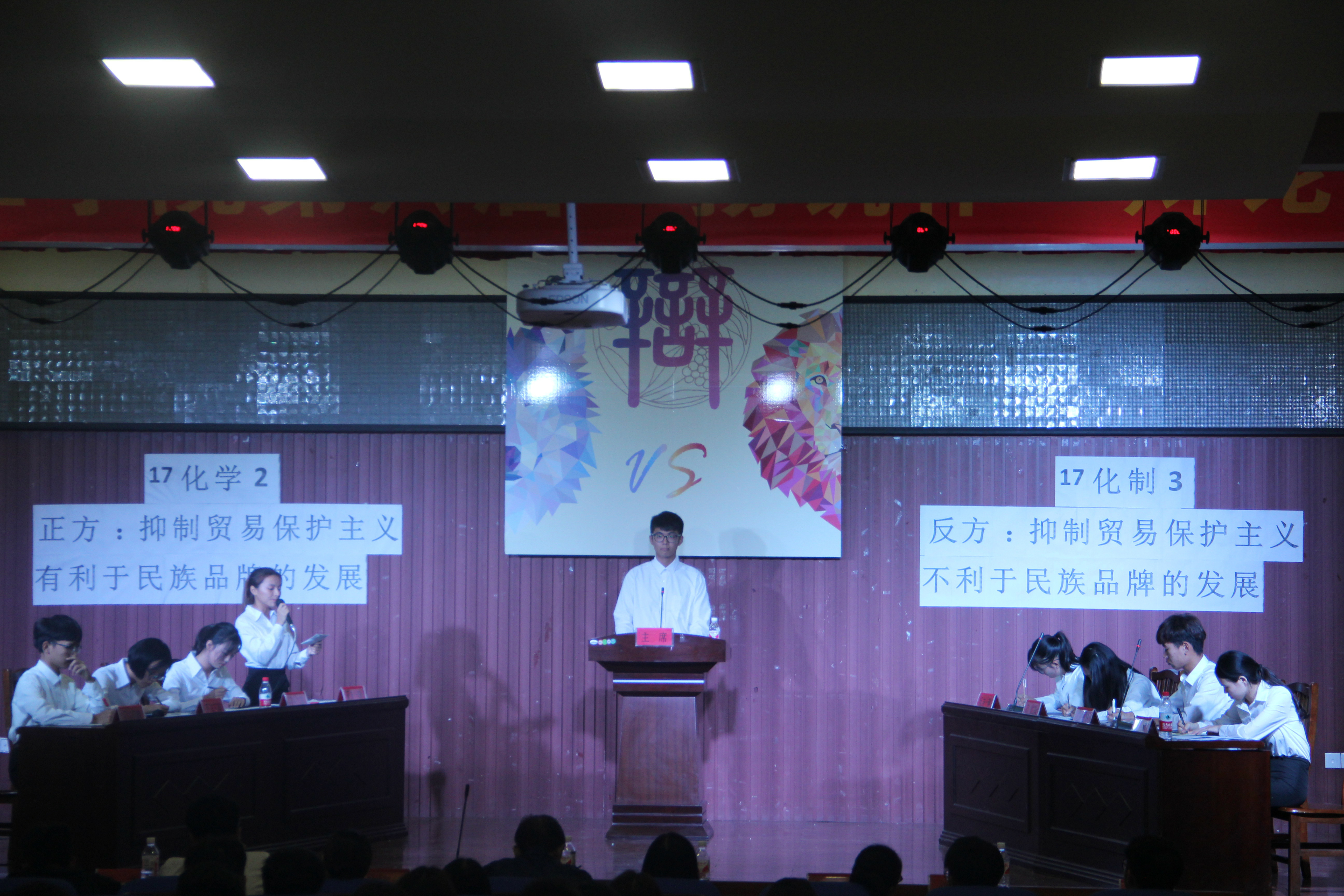 经过前面几场辩论赛的角逐,台上的四支队伍已然成长不少。在简单的开场后,2017级化学类2班辩论队与2017级化工与制药类3班辩论队就“抑制贸易保护主义是否有利于民族品牌的发展”这一辩题进行激烈的对决。2017级化学类2班辩论队持赞同观点,他们认为:中国民族品牌需要在恶劣的环境下学会生存,不能让国产成为劣质的挡箭牌。同时坚持限制和开放才能争取到公平的国际地位。与此相对的,2017级化工与制药类3班辩论队则认为:不需要抑制贸易保护主义,主要原因是中国自主品牌竞争力较弱,而外国品牌的冲击是国产难以阻挡的。在辩论中,双方紧扣主题,每位辩手都旁证博引,引经据典,妙语连珠,让现场观众听的津津有味。