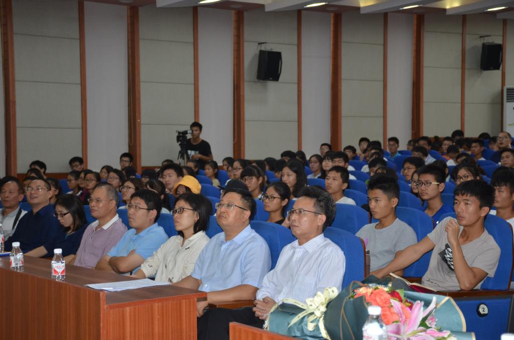 【大学生通讯社报道】10月29日下午,国际纳米科技领军人物、中国科学院外籍院士、欧洲科学院院士王中林教授莅临我校西校区扬帆楼135报告厅作“从麦克斯韦位移电流到基于纳米发电机的自驱动系统和蓝色能源”主题报告,与师生分享新时代纳米发电机驱动的自供电系统与蓝色能源。学校党委副书记廖安平教授主持,化学化工学院党委陆宏儒书记,院长谭学才教授,副院长黄钦教授、刘绍刚副教授等学院领导出席,来自化学化工学院等学院的师生到场聆听报告,扬帆楼135报告厅座无虚席,部分学生站着听完了讲座。