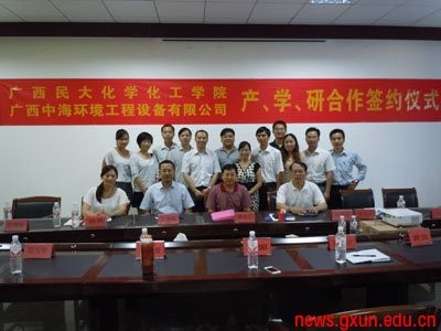 2012年7月20日上午,化学化工学院与广西中海环境工程设备有限公司签订产、学、研合作协议。双方在环保领域内的人才培养、技术研发以及相关专业学生就业等方面达成合作协议,有力地推动了我校产、学、研项目的进展。